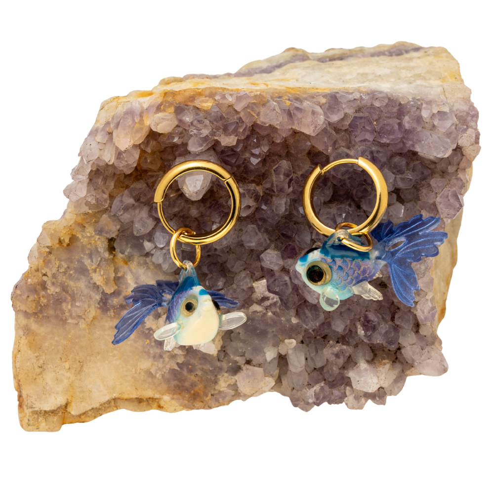 Lleva contigo la elegancia y el movimiento del océano con estos exclusivos aretes de pez azul. Cada pieza ha sido diseñada para capturar la esencia de la vida marina, presentando un delicado pez en tonalidades azul vibrante, celeste y blanco, con detalles minuciosos en las aletas y ojos expresivos. Estas piezas destacan por su excepcional acabado hecho a mano y cuentan con una medida de 3.5 cm de alto, el tamaño ideal para lucir un diseño detallado y sofisticado.